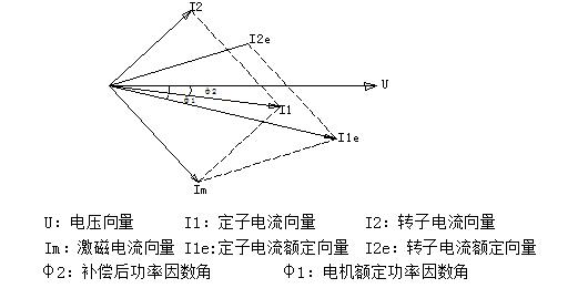 從圖可以看出,靜止式進(jìn)相器和電容補(bǔ)償對(duì)電機(jī)的作用點(diǎn)不同,電容是在電機(jī)的前端定子側(cè)進(jìn)行補(bǔ)償,其補(bǔ)償范圍是在補(bǔ)償點(diǎn)的前端;靜止式進(jìn)相器串聯(lián)在電機(jī)的后端,其補(bǔ)償范圍擴(kuò)大到了電機(jī)。